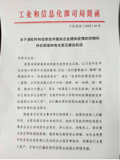 關(guān)于請軟件和信息技術(shù)服務(wù)企業(yè)提供疫情防控期間存在困難和有關(guān)意見建議的函各有關(guān)企業(yè): 新型冠狀病毒感染的肺炎疫情發(fā)生以來,以習(xí)近平總書記為核心的黨中央高度重視,作出一系列重要指示,強(qiáng)調(diào)“疫情就是命令,防控就是責(zé)任”,指出“疫情防控要堅(jiān)持全國一盤棋,必須…